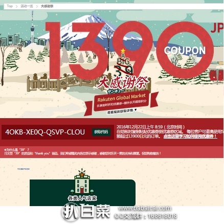 乐天国际:年末感谢祭!满13900日元减1390日元优惠券可用+返5%积分+,每个账号可用5次!