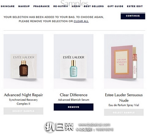 一般情况下,官网每单可以选择一个小样赠品,点结算后,下一步就到了选择小样的页面,任选一件,点击下方的“SELECT SAMPLE”即可,然后点continue按钮。