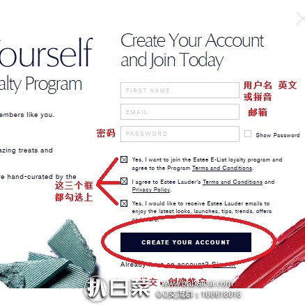 *需注意:密码栏下方的三个小方框都勾选上,第一个是免费加入雅诗兰黛ELIST Loyalty忠实会员,购物可以返积分,1美元为1积分,积分攒多了可以按等级兑换8折码以及正装产品等;第二个是雅诗兰黛注册的同意确认条款;第三个为是否需要促销邮件则为选勾项,这个倒是可以按照自己的需求选择,建议点上,这样官网有活动会给你发邮件。