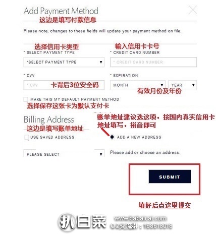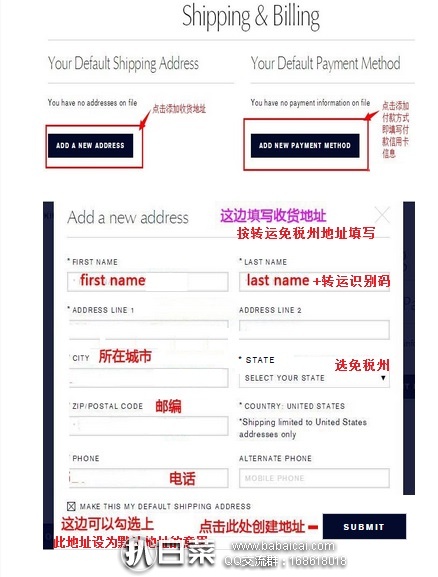 左侧“SHIPPING & BILLING”,进去填写收货地址、账单地址和支付信息,也可以下单时填写。收货地址也按转运地址填写(选转运的免税州地址哦),输入时一定要注意信息的准确性。