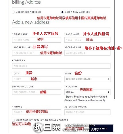 上图里的账单地址按说明勾选上添加新地址后,进入信用卡账单地址填写页面,完整填写信用卡的账单信息,包括姓名、地址及电话,用拼音填写即可。国家先选中国。(这里需说明:雅诗兰黛官网虽然可以使用与转运地址相同的账单地址,但却要承担小概率砍单的风险,所以还是建议大家使用国内真实的信用卡账单地址,就是你在银行申请信用卡时留的地址。购物网站要求填写账单地址,是为了核对信用卡真伪,人家也怕信用卡诈骗哦),账单地址填写参考下图: