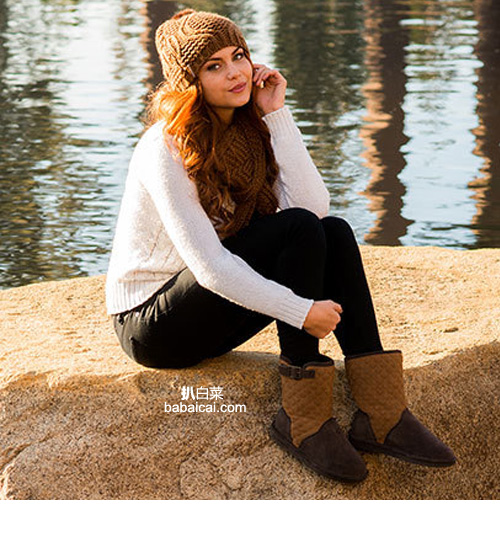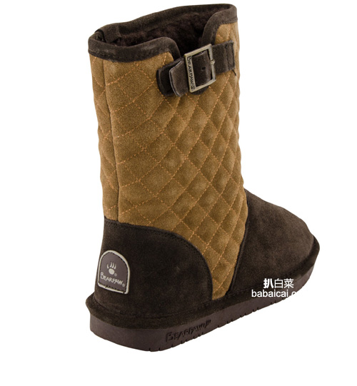 BEARPAW Leigh Anne 熊掌雪地靴,是熊掌2014新款。结实耐穿的反绒牛皮鞋面,鞋帮衍缝菱格装饰,金属搭扣调节松紧。羊皮鞋垫,TPR热塑性橡胶大底。虽然不是皮毛一体,不过质量上佳的羊皮内衬植羊毛,也同样能提供出色的保暖性。BEARPAW熊掌品牌2001年才创立,历史并不悠久,它是一家专业提供雪地靴的美国鞋类品牌,自从创建以来,凭借着良好的做工和用料,和平易近人的价格,赢得了出众的口碑,在Amazon所有女靴的总销量排名靠前,可见BEARPAW在美国的巨大市场号召力。