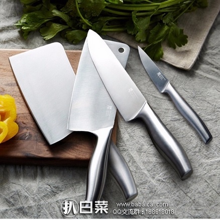 这款德式六件套不锈钢刀,双立人制造商生产,刀身采用50Cr15MoV不锈钢打造,不易生锈锋利持久,符合人体力学的鱼腹设计握感舒适,空心柄使用起来更顺手。刀座采用成年桦木材质,用料厚实牢靠,底部采用环保防滑垫,隔离易积水的台面,使得babaicai.com刀槽通风干燥,减少二次污染。套装内包含:3.5寸水果刀、6.5寸砍骨刀、7寸菜刀、8寸厨师刀、 剪刀和木座。这套刀具基本可满足普通家庭的日常需求。