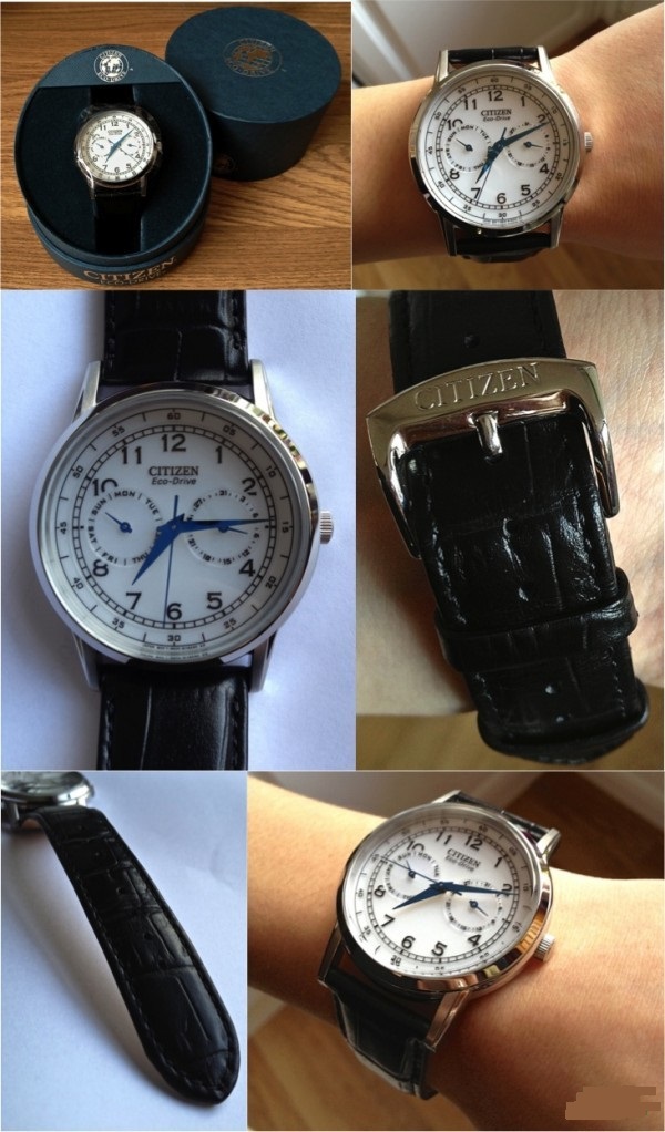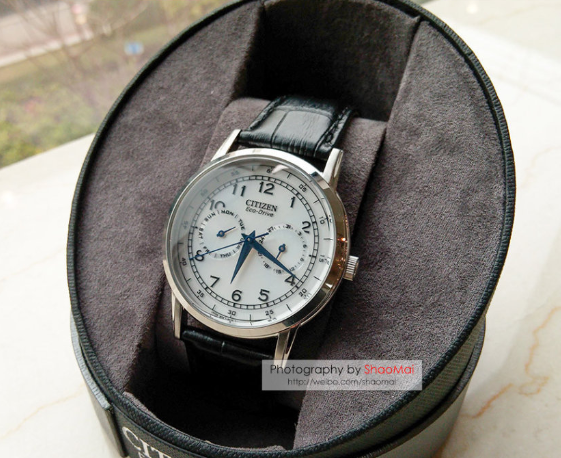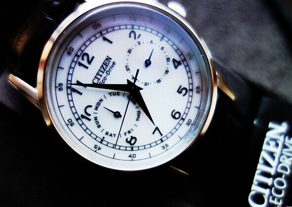 采用亮骚的白盘蓝针黑字的表盘设计,两个小表盘分别显示日历和星期,觉得是最好看的西铁城表款之 一,总体设计颇有IWC的风格,简洁时尚大气。秀外慧中,内在也很美,采用西铁城引以为傲的光动能技术,Eco-Drive 8635光动能机芯,可吸收可见光作为能源,终身无需更换电池,环保节能又方便实用;不锈钢表壳搭配白色表盘,黑色真皮表带,矿物质防刮表镜;两眼设计;30m防水;表径42mm,厚11mm。