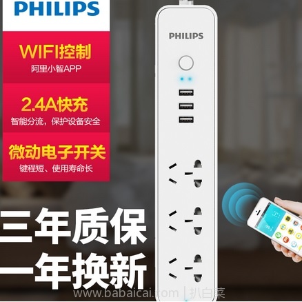 领券降¥20,新低¥49包邮,智能插排。可WIFI控制,支持定时开关,支持天猫精灵,插排也能智能。Philips 飞利浦 SPS5213E/93-W 3插孔3USB智能排插,天猫商城 飞利浦源卓航专卖店11点淘抢购售价直降至¥69包邮,可叠加¥20优惠券,折后实付¥49包邮,很划算,阿里智能3USB快充,支持天猫精灵新款天猫精灵 M1 智能音箱淘抢购价¥299包邮,可预约了)。天猫商城购买地址>>天猫更多特价推荐看这里>>