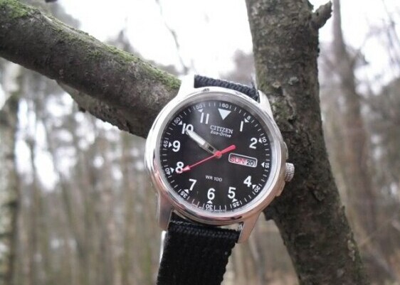 这款编号BM8180-03E的西铁城光动能男表,采用类似飞行员表款的设计,12点钟方向倒三角设计,夜光也很炫目,有德味的哑光炭黑色表盘也很有特色,带夜光的白色指针和数字刻度搭配撞红色秒针,整体效果较骚。机芯是CITIZEN最擅长的Eco-Drive光动能石英机芯,吸收日常可见光作为能量来源,终身无需更换电池。表盘直径37mm,厚度9mm,3点钟方向带有星期和日历双显,耐磨帆布表带,防水达到100米。