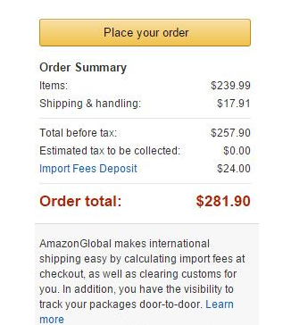 前天此价时很快抢光,今天美亚补货啦,目前Amazon售价仍为历史低价$239.99,比特价时的价格$249.99还低$10直邮运费只要$17.91,预交关税仅$24,含税总价$281.9,这东西大概10磅多,显然比转运划算得多,且不用担心被税了,直邮到手$1745。亚马逊购买地址>> (打开如果不是自营,请右下角自营(Amazon。com)$239.99那个加入购物车购买)     |  美国亚马逊Amazon直邮中国手把手教程