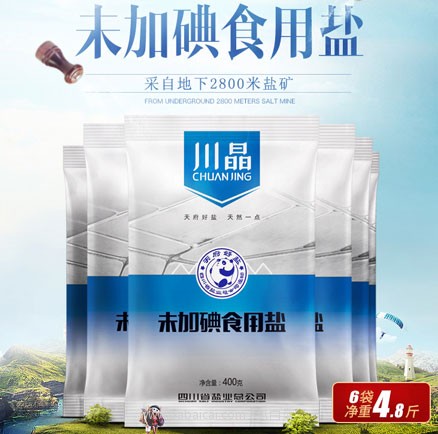 川晶 天然未加碘食用盐 400g*6袋,四川井盐源远流长,据文献记载和专家考证,享誉世界的大英县卓筒井创始于北宋庆历年间,比西方要早八百多年。川晶是四川盐业旗下主打品牌。