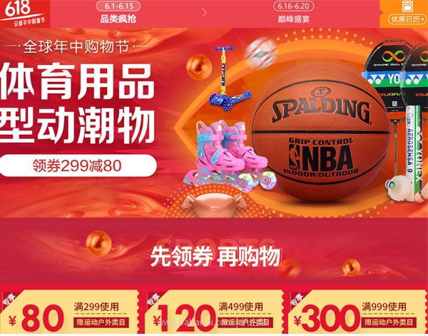 京东商城:全球年中购物节 体育用品·型动潮物可领¥299-80/¥499-120/¥999-300等多档优惠券    16日0点开始~