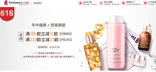 西班牙Perfume’s Club中文网:618大促 全场满89欧减6欧 / 满119欧减15欧 下单送20欧大礼包+满60欧免邮+享税费补贴