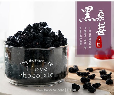 天猫商城500g售价¥25,可领取¥3优惠券(移动端复制淘口令€reQtb0ScFdS€,打开手淘即可领券),实付¥22包邮,新疆野生无沙黑桑葚干,真正的原生态水果,可干吃可泡茶泡酒。黑桑葚果实中含有丰富的活性蛋白、维生素、氨基酸、胡萝卜素、矿物质等成分,营养是苹果的5倍,是葡萄的3倍,具有多种功效,天猫商城购买地址>>