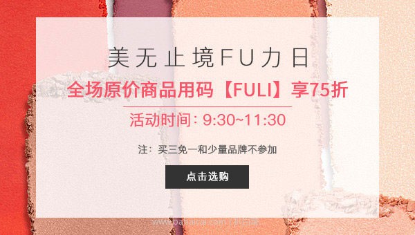 Feelunique中文网将于北京时间8月1日早9点30分开启阶梯折扣,原价商品用码“FULI”享最高7.5折优惠,越早买越划算,促销有效期至北京时间8月2日早10点;Feelunique中文网活动地址>>