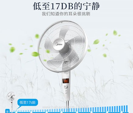 Midea美的FS40-17JRW家用遥控变频落地扇,搭载智能变频电机,最低转速时运行噪音仅17.4分贝,保证夜晚的优质睡眠。拥有12档风速可调,并且带有睡眠风、自然风、静音风以及智能风4种模式可选,5片仿生羽翼扇叶设计风柔范围广,能够满足不同环境下的需求。360°旋转调风,一键更换模式,支持10米遥控操作,带智能断电记忆功能,12小时预约开关机,使用更加方便省心。