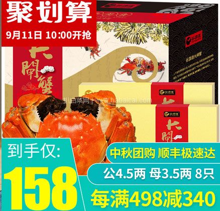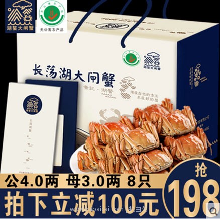 天猫商城:湖螯长荡湖大闸蟹 礼券( 公4两4只+母3两4只)现价¥298,叠加¥180优惠券,券后实付¥118包邮 自用送礼两相宜~