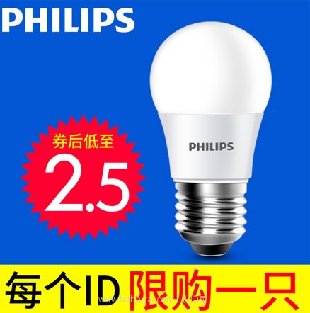 天猫商城:Philips 飞利浦 2.5W LED节能灯泡 现价¥4.5,领取¥2优惠券,下单实付¥2.5包邮    自然光,节能长寿~