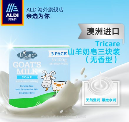 • 全部评论 天猫商城:ALDI 奥乐齐 澳洲进口 tricare Goat’s milk soap 山羊奶皂无香型 100g*3块*2盒装 价¥69.9元,领取¥20元优惠券,实付¥57.73元包邮含税已关闭评论