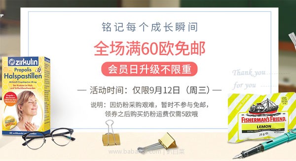 德国保镖大药房:活动升级!教师节全场满€60免邮不限重(奶粉不参与)叠加满€78-3/€88-5优惠券 支付宝日活动升级,仅限今日!~