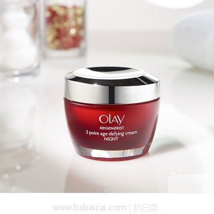Olay Regenerist 3 Point Firming Anti-Ageing Night Cream Moisturiser for Firm Skin玉兰油 新生塑颜3点抗衰老晚霜,容量50ml,利用先进的肌肤活力技术加速表层细胞代谢而对抗肌肤疲劳,经过临床验证的烟酰胺、五胜肽和独家Lys'lastine弹力重构因子组合配方,提供一整晚长效肌肤保湿,让皮肤babaicai.com时刻水润、丰盈,给肌肤充分补水保湿,并提高肌肤自身的免疫力,有效对抗细纹,增加肌肤弹性,细致毛孔,提拉紧致。烟酰胺帮助肤质改善,淡皱纹、细纹,令肌肤充盈饱满,法国五胜肽,犹如胶原细胞的钥匙,开启其合成胶原蛋白的活力,水润肌肤,提升弹性,紧致面部肌肤。