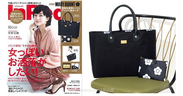 In Red 10月号 赠MARY QUANT特制手提包&雏菊收纳小包,可以轻松装入杂志尺寸的手提包非常受日本人喜欢,容量很大也可以单肩背,金色的logo提升质感。同款的收纳小包则是经典的雏菊印花,和包包内衬的图案一致。