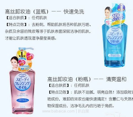 这款KOSE ソフティモ スピーディ クレンジングオイル 230mLsoftymo卸妆油含天然保湿成分,有效卸除面部及眼部化妆,温和不刺激成份,保护细嫩脆弱肌肤,清爽柔软。能轻易去除脸部老旧角质与彩妆,能深入脸上细微处,将囤积在毛孔与肌肤的污垢去除。不论是皮脂、彩妆、汗水或灰尘,不论是亲油性或亲水性的污垢,都能一次洗净。babaicai.com清除黑头、白头,预防粉刺黑头的生成。让肌肤澄净白皙,使用后肌肤呈现应有的光采。