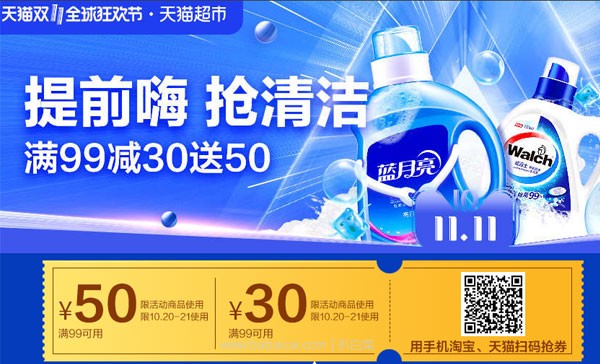 天猫超市目前已放出双11清洁预热专场,20日0点可抢满99元减50元优惠券,另有满99-30元、满199-40元、满399-80元优惠券可领,其中199-40元券可用于生鲜商品,399-80可用于母婴品。另有满赠专区,参加满99元减30元即送50礼包,六种精选商品最多可选2种。天猫活动地址>>
