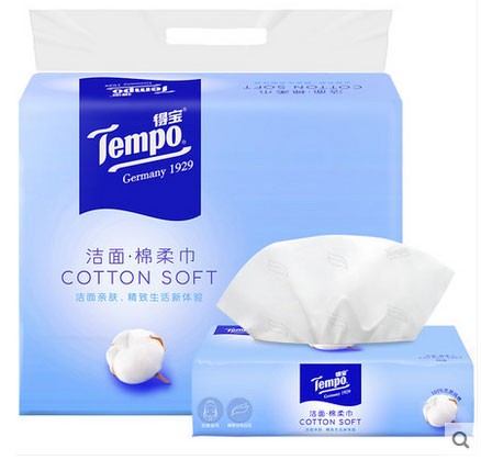 TEMPO 得宝 纯棉纸巾干湿两用全棉柔巾 90抽*3包,得宝是德国的,在香港和德国比较火,最大的特性就是韧性好,比较不怕湿水,没有纸屑。你买一包打开摸一下就知道差别了。网友反馈:纸很有韧性,质量非常好,与卖家描述的完全一致,再便宜点就非常满意了,真的很喜欢,完全超出期望值!
