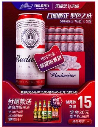 31.1【双11预售】Budweiser/百威啤酒经典醇正500ml*18听罐2箱装促销