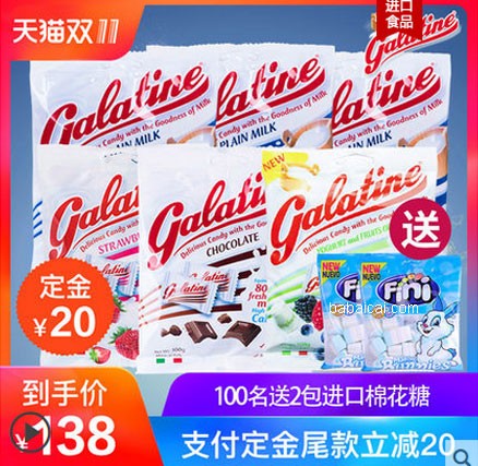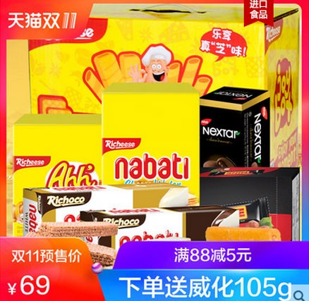 超值礼盒,内容是炒鸡美味的产品,雪饼,旺仔牛奶,babaicai.com、qq糖,乳酸饮品等,双十一预售99元,可领取10元优惠券,到手价84元。