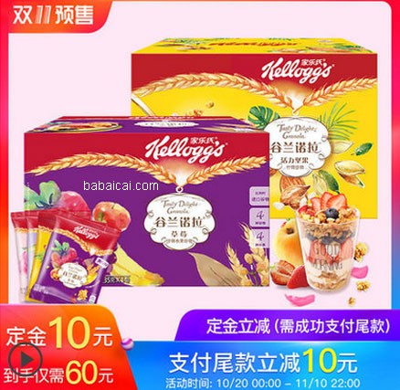 坚果+果干+水果,吃出健康,适合脑力劳动者。办公室里放一箱,下午茶的时候享用;家里放一箱,惬意的周末加点料,定金10立减10,还可以领券减¥10(优惠券单领,先领了,付尾款自动减),到手价58,这么一大箱,不多囤一点都觉得亏了~