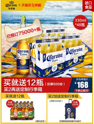 买就多送12瓶精酿啤酒 买2再送科罗娜行李箱 订金40 立减20