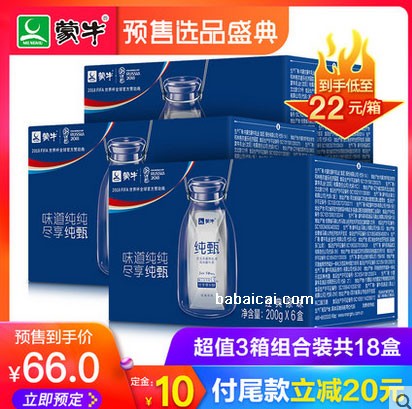 纯甄是一款不添加色素、香精和防腐剂的高端酸牛奶产品,口味简单纯净,定金10立减20,超值3箱18盒,到手价仅66元,每天必备的酸奶,快入!