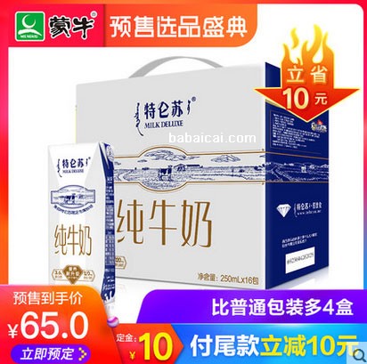 不是所有牛奶都叫特仑苏!定金10立减10,比普通包装多4盒。喜欢纯牛奶的肯定不会错过特仑苏。