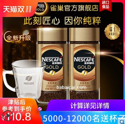 8.2【双11预售】雀巢金牌速溶冻干黑咖啡瑞士进口纯咖啡粉100g*2瓶