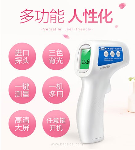 可孚 红外线体温计,型号为HTD8818D,采用进口传感器,红外光源工作于直流或脉冲方式,1秒测温,2种功能模式,可测体温、奶温、水温、室温;3色背光显示,提示宝宝体温处于低烧还是高烧;50组记忆功能,高清数字大屏,傻瓜式操作,按任意键即可开机,老人小孩都会使用。网友反馈:方便快捷,读数率也比较准确,还可以测量物体温度,用来测量给孩子冲的奶粉温度。