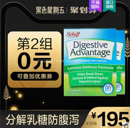 天猫国际Schiff旭福官方海外旗舰店30粒*2盒装黑五扫货价¥195,可2件5折,还可领取店铺¥100优惠券,一次购买2件共计4盒双重优惠实付¥95包邮包税,折合¥23.75/盒,白菜价!专门针对乳糖不耐受症状的配方,可以缓解因乳糖不耐受产生的腹鸣、腹泻等症状,长期继续使用可促进消化系统的健康。天猫商城购买地址>>