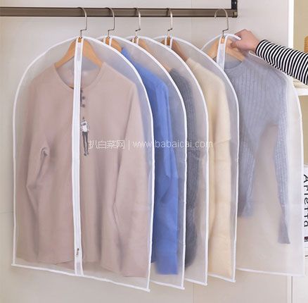 沃尊 防尘挂衣收纳罩10个装,采用PEVA材质,半透明磨砂质感,方便水洗,防尘、防虫,收纳衣物方便,存取简单,再也不用担心衣服褶皱,存放也不会被灰尘浸入。中号款适合高度70cm以内的短款外套、毛衣等,大号款适合高度90cm以内,膝盖以上的风衣、中长款西装、长款羽绒服等;特大号适合衣物高度110cm以内,到膝盖的长款大衣,超大号适合衣物高度130cm以内膝盖以下的超长款。