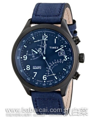 Timex Men's T2P512DH Intelligent Quartz Fly-Back Chrono Analog Display Analog Quartz Blue Watch多功能计时男表,属于TIMEX标志性的IQ系列,采用天美时特有的六指针机芯,表径43mm,厚度13mm适合大多数人佩戴,离子镀灰表壳搭配蓝色指针,10点钟24小时计时,5点钟10分钟计时,3点钟日历显示,表盘外沿为测距、测速、深度等测量表圈,计时指针采用超酷飞返/逆跳式设计,4指针包括小时、分钟、秒钟、以及计时码表,当然TIMEX招牌式的INDIGLO®夜光表盘是不可或缺的,小牛皮表带,防划矿物表镜,防水深度100米。
