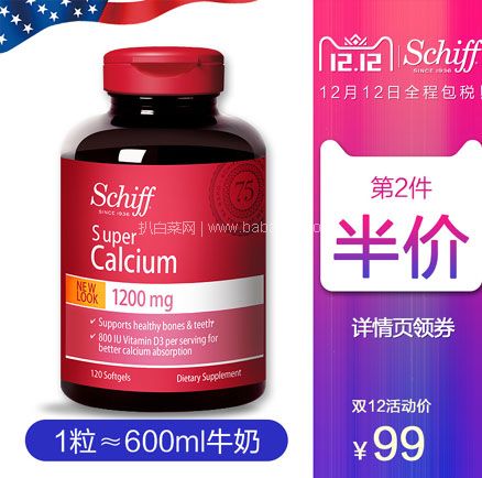 天猫国际Schiff旭福官方海外旗舰店目前这款Schiff 液体钙软胶囊120粒,双十二售价¥99,可领取店铺¥40优惠券,实付¥59包邮包税,可第2件半价,2件用券实付¥108.5包邮更划算。天猫国际购买地址>>