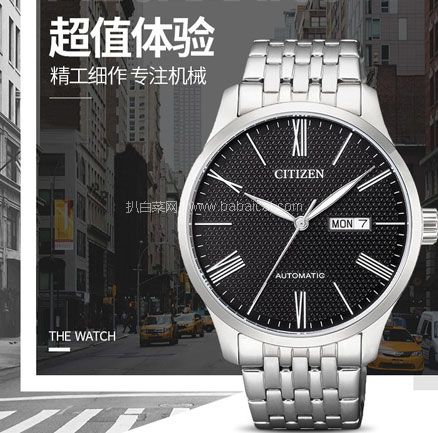 Citizen 西铁城 自动机械男士手表 NH8350-59E,采用自动机械机芯,黑色罗马钉表盘简约大气,带罗马数字时间标示以及3点处拥有日期和星期显示,合成矿物质玻璃,不易磨损。精钢表带,大方舒适。表盘直径40mm,厚11mm。防水深度50米。