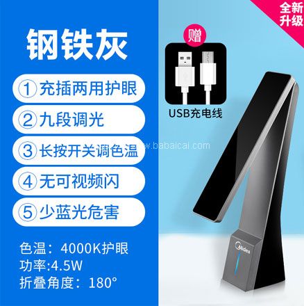 美的 LED 充电式台灯,4.5W大功率,充插两用,采用LED光源,避免蓝光无刺眼;触摸式感应调光,九种光线可调,满足多种用光需求,带USB接口,内置1200mAh 大容量蓄电池,满电状态续航时间可达8小时。