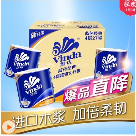 苏宁易购:每满¥199-60券专场!Vinda 维达 蓝色经典有芯卷纸 4层140g*27卷 拍5箱+2箱洁柔同规格 折后仅合¥39.75/箱! 好纸张好价格!