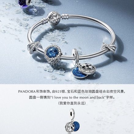 Pandora 潘多拉 复古夜空 925蓝色吊饰 791993CZ ,凭着灵动细致的超凡工艺,让每位女性的独特之处都更为闪耀,PANDORA吊饰串饰,由925银、宝石和蓝色珐琅圆盘组合出夜空风景,圆盘一侧镌刻“I love you to the moon and back”字样。(我爱你直到永远)
