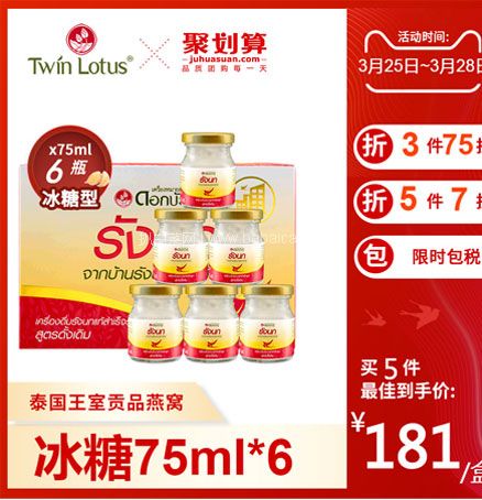 天猫商城:泰国王室贡品燕窝 TwinLotus 双莲 冰糖即食燕窝 75mlx6瓶 现价¥259,领¥150元优惠券,券后¥109包邮 好价~