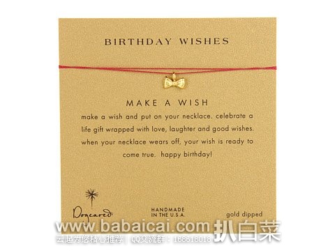 许个愿,然后戴上你的项链,当丝线断了的时候,你的愿望就会实现!Make a wish系列是Dogeared 最有名、最经典的系列,很多人还不知道该品牌的时候,就已经听说过许愿项链!它也是最受全球DD迷们热爱的系列之一!由它简单美好的寓意便可看出,Dogeared一直在用心传递爱与希望!这是一件非常合适的生日礼物,美国加州手工制作,内附MAKE A WISH许愿卡片,丝线标准长度 16"(约 40cm-41cm),银镀金蝴蝶结吊坠高约 5mm。
