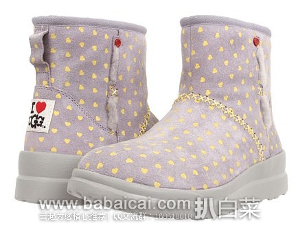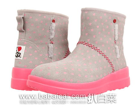 I HEART UGG以甜美可爱风格引领年轻女孩时尚热潮,舒适的穿着体验、新潮的别致设计,成为年轻女孩鞋柜中必不可少的搭配元素,这款短靴照旧采用的皮毛一体的整块美利奴羊皮,内部有着厚厚的羊毛,属于I heart UGG系列,设计风格甜美可爱,适合萌妹纸们。
