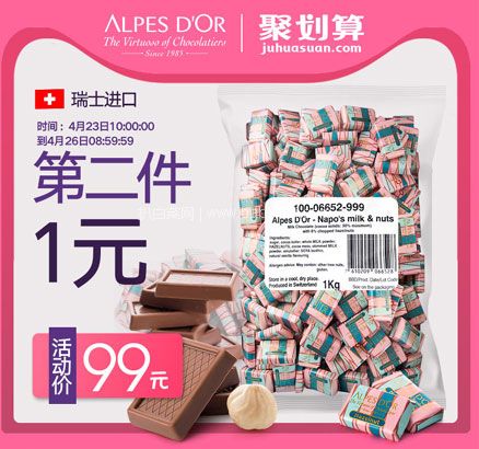 天猫商城:瑞士进口 Alpes d’Or 爱普诗 牛奶榛仁果仁巧克力1kg 下单2件,双重优惠后¥70包邮,折合¥35元/件已关闭评论 0