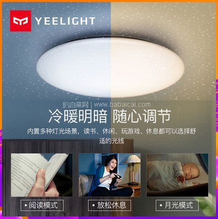 这款小米Yeelight LED智能吸顶灯,功率为28W ,选用240颗进口灯珠,显色指数Ra可达95,真实还原自然光,色温在2700-6500k之间可调,亮度0.1~1800明流可调,支持手机APP、蓝牙遥控器以及墙面开关控制。耦合器快装模块,方便拆装,清洁起来更加方便。当然作为小米生态链旗下产品,智能功能必不可少,这款吸顶灯能够通过关联小米手环实现入睡自动熄灯,同时还拥有小夜灯模式方便,方便起夜。