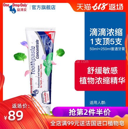 天猫商城:德国原装进口 One Drop Only 益滴妥 草本舒敏浓缩牙膏50ml 现价¥89,领¥70优惠券,券后实付¥19包邮 草本舒敏抗菌,高浓缩1支顶5支~
