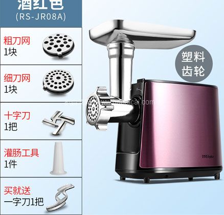 天猫商城Royalstar荣电专卖店经典版售价¥229,可使用¥40优惠券,实付¥189包邮,随机配十字刀头、粗刀网、细刀网,灌肠工具,下单再送一字刀片,其他渠道普遍售价¥229以上。可灌肠,1分钟2斤肉,还原手工剁肉口感,不需要剁肉到手酸,轻松做出顺滑可口辅食,开启细腻辅食时代。天猫商城购买地址>>