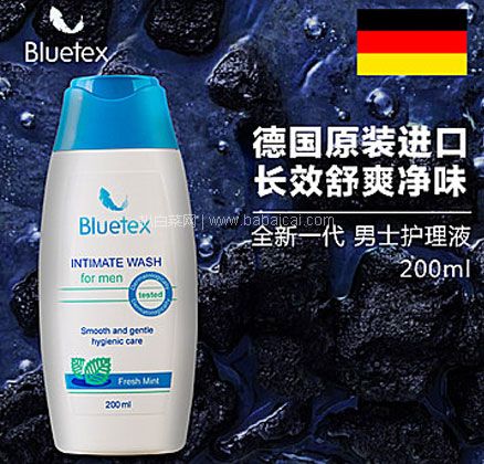 德国原装进口Bluetex 男士私处洗液,为男性敏感部位设计,微弱酸中性配方,PH值6~7,接近私处酸碱度,含有薄荷,双倍抑菌,温和清洁,不含药物,不含皂基,通过德国专业皮肤测试,维护私处洁净健康,预防各种男科疾病的发生。
